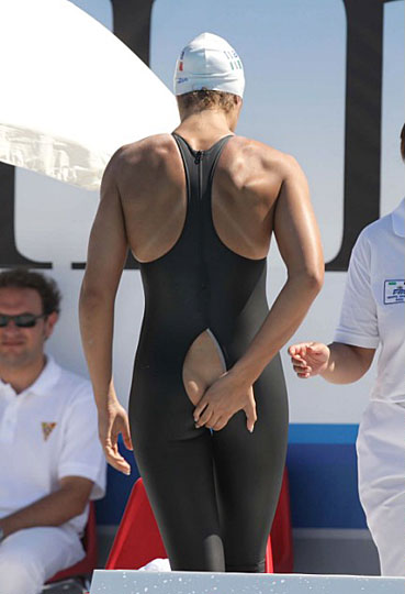 据英国媒体7月1日报道,意大利游泳名将Flavia Zoccari在参加地中海运动会游泳比赛时,泳衣臀部裂开一条大口子,令该位选手十分尴尬,并最终退出该项比赛。