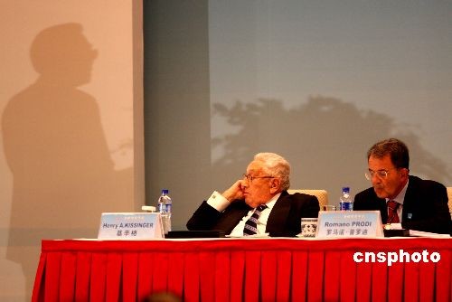 图为基辛格、普罗迪倾听国务院副总理李克强致词。中新社发 武仲林 摄