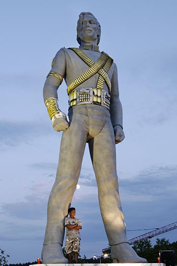 这是7月2日在瑞士苏黎世附近的雷根斯多夫拍摄的已故美国流行音乐巨星迈克尔·杰克逊的塑像。这尊12米高的塑像于7月3日至5日在这里正式展出,以纪念6月25日突然辞世的一代流行音乐“天王”迈克尔·杰克逊。