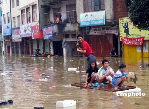 一些居民自制简易舟渡过水淹区域。中新社发 蒙鸣明 摄