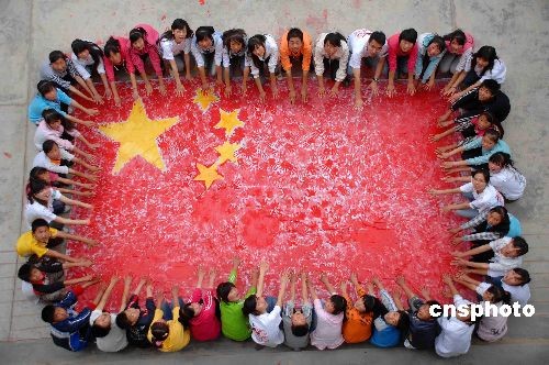 7月6日,“同在蓝天下,共绘一面旗”活动在甘肃省礼县洮坪乡初级中学举行。地震灾区礼县洮坪乡初级中学的300多名学生和来自江苏省扬州大学文学院的大学生志愿者用涂满颜料的双手共同“印”制了一面长5.6米、宽3.2米的“手印国旗”,分别象征我国拥有56个民族和32个省级行政区,以此迎接新中国成立60周年。 中新社发 陈中秋 摄