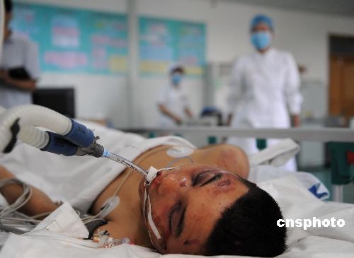 7月6日,新疆乌鲁木齐友谊医院,一名重伤者靠呼吸机维持生命。