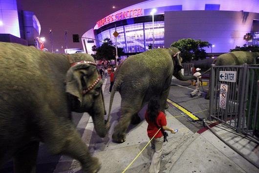洛杉矶,当地时间7月7日,流行音乐之王迈克尔·杰克逊(Michael Jackson )的公众悼念仪式将在美国洛杉矶的斯台普斯体育中心举行。仪式开始前,世界著名马戏团玲玲马戏团(Ringling Bros. And Barnum & Bailey)的11头亚洲象和7匹马经过这里,不知是否是要在悼念仪式上进行表演。David McNew/CFP