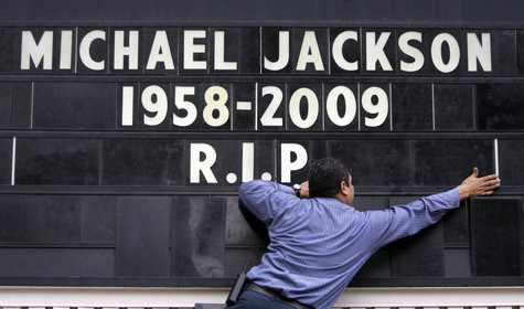 北京时间7月7日晚洛杉矶的斯台普斯体育中心旁的Holiday Inn酒店外墙上也专门写上了杰克逊的名字和生卒年月,在告别仪式即将开始前,工作人员认真的擦洗,以此表示对流行天王的悼念。