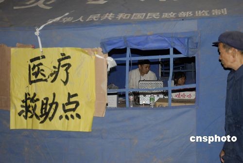 图为首批进入重灾区官屯乡官屯村的医疗队在灾民临时安置点设置了医疗救助点。中新社发 保旭 摄
