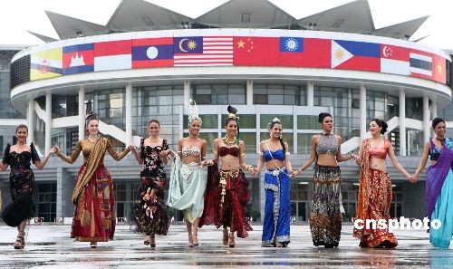 7月20日,2009亚洲超级模特大赛在中国南宁拉开序幕,来自日本、韩国、新加波、泰国、马来西亚、印度、越南、蒙古、菲律宾和中国10个亚洲国家的近40名选手汇聚南宁,参加亚洲超级模特大赛总决赛的角逐。图为参赛的各国选手在广西会展中心亮相。 中新社发 钱兴强 摄