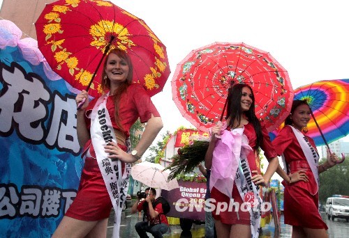 7月21日,“环球皇后”佳丽冒雨在牡丹江市街头参加巡游活动。当日,黑龙江省牡丹江市出现降雨天气。上午9时,来自世界各地的60余名“环球皇后”佳丽乘坐20余辆花车,冒雨亮相在牡丹江城区主要道路。据悉,当晚,2009年“环球皇后”大赛的“最佳才艺”单项奖将在牡丹江市角逐产生。中新社发 庄文斌 摄