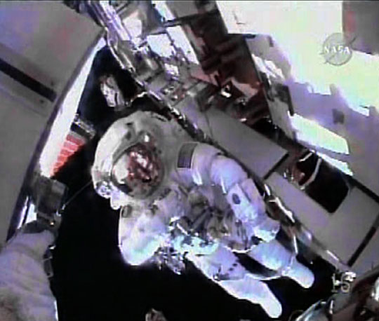 美国“奋进”号航天飞机的两名宇航员22日出舱进行升空以来的第三次太空行走,为国际空间站更换了两块电池。