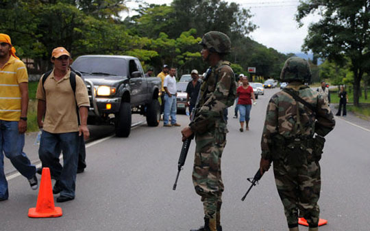 被罢免总统塞拉亚的支持者从士兵身边走过,准备前往洪尼边境迎接塞拉亚。