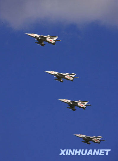 中国空军强-5强击机编队通过检阅台上空。查春明 摄