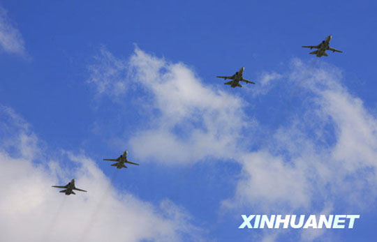 7月26日,俄罗斯苏-24战斗轰炸机编队通过检阅台上空。查春明 摄