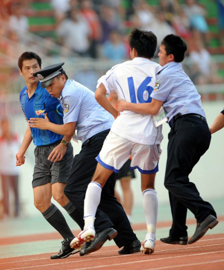 7月26日,在全运会男子足球甲组北京队与天津队的比赛结束后,天津队球员由于对裁判的判罚不满,追打主裁判何志彪。范长国 摄