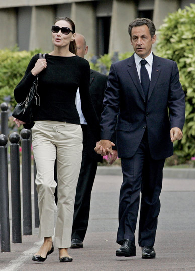 2009年7月27日,在慢跑时出现不适后被紧急送院的法国总统萨科齐在妻子布吕尼的陪同下出院。