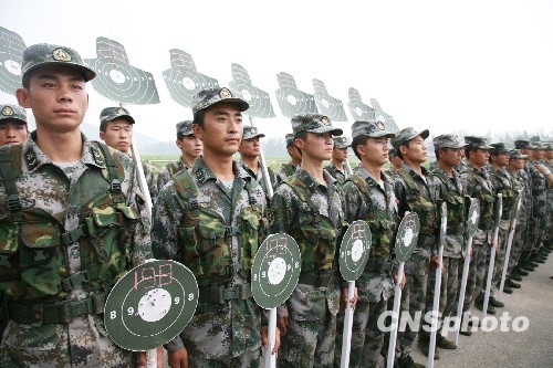 图为官兵在列队演练后,向中外记者展示击中目标的环数。中新社发 张子扬 摄
