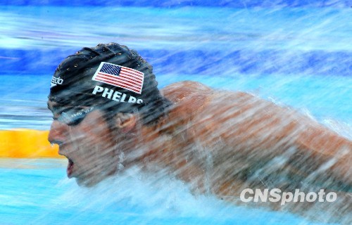 罗马时间7月29日晚上,美国选手菲尔普斯在男子200米自由泳项目中被德国选手比德尔曼轻松击败,遭遇四年来的首次个人项目的失败。图为菲尔普斯在男子200米蝶泳半决赛中