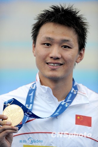 张琳为中国游泳队收获了此次罗马世锦赛的首块金牌,同时也将世界纪录缩短了6秒。这是中国男子游泳在世界大赛上获得的第一枚金牌。中新社发 廖攀 摄