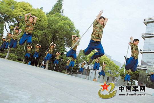 为锤炼国防生的军事素质,江苏科技大学利用暑假时间,组织190名国防生顶烈日、冒酷暑进行了为期一个月的军训。图为国防生进行棍棒体能训练的情景。 夏纪福摄