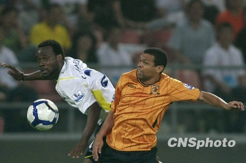 图为托特纳姆热刺队21号齐姆邦达(左)与赫尔城队10号戈麦在比赛中兹争抢。中新社发 任晨鸣 摄