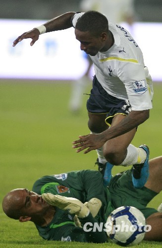 图为托特纳姆热刺队18号迪福(上)在比赛中遭遇对方守门员拦截。中新社发 任晨鸣 摄