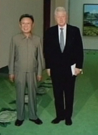 朝鲜最高领导人金正日和美国前总统克林顿在平壤合影。