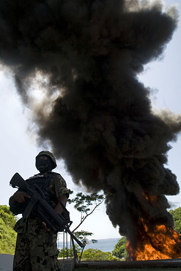 图为士兵在毒品焚毁现场警戒。