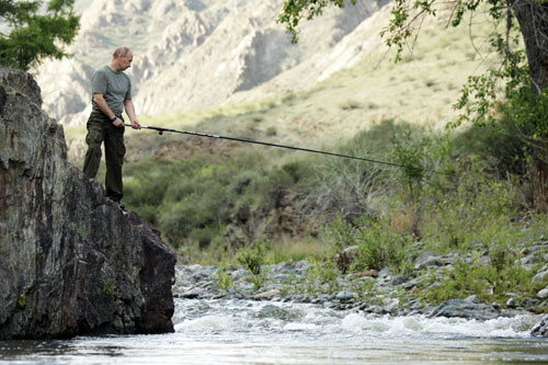 8月3日,俄罗斯总理普京在西伯利亚南部度假时在河边钓鱼。