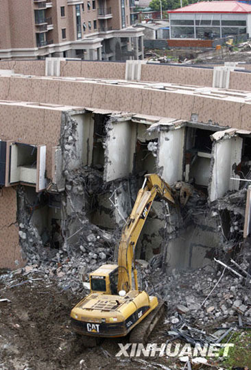 8月5日,工程车辆正在拆除倒覆楼房的外墙面。
