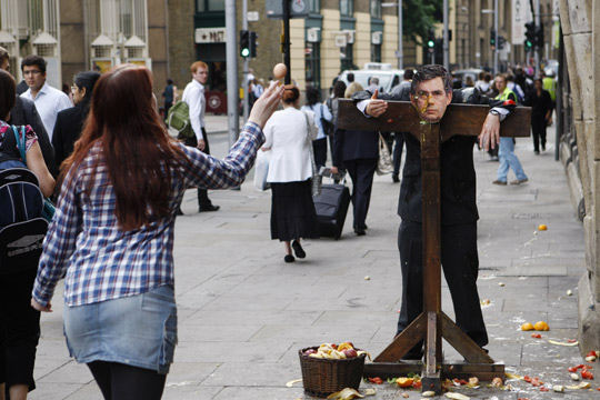 8月6日,英国伦敦,英国首相布朗的头像被安放在街头的一处“断头台”上,被过往的行人用鸡蛋砸。2008年以来,英国陷入经济危机泥潭,加上近来国会开支丑闻曝光,布朗遭到在野党的批评。