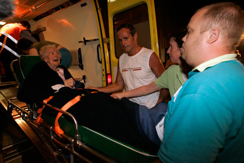 图为急救人员将伤着抬上救护车。当日,比利时东北部村庄梅勒一家养老院发生火灾,造成9名老人死亡另外4名重伤。