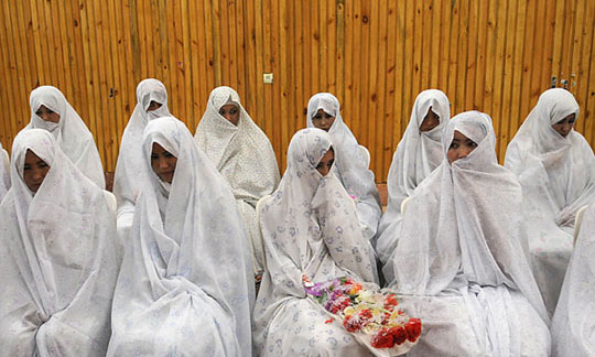 8月7日,有50对阿富汗新人参加了在赫拉特省举行的集体婚礼。图为新娘们并排坐在婚礼仪式上。