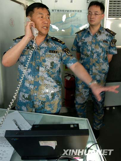 海军第三批护航编队指挥员王志国(左)在“舟山”舰指挥编队战舰前往求援海域实施救援。