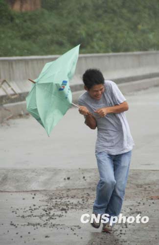 8月8日,今年第8号台风“莫拉克”临近,福州一市民在桥上举步维艰。中新社发 王东明 摄