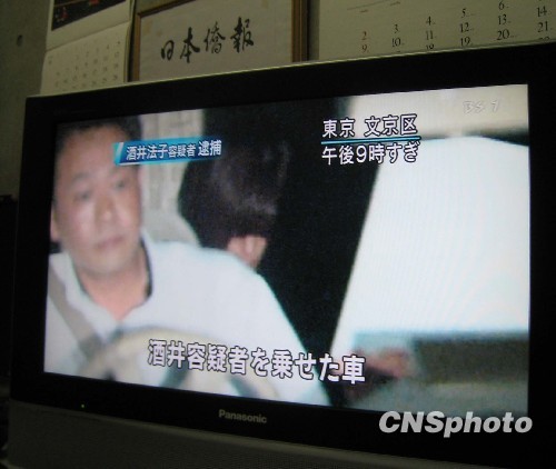 8月8日晚,涉嫌吸毒被警方追捕的日本人气女星酒井法子到东京都警视厅富坂警察署自首,日本电视媒体突出报道了酒井法子自首的新闻。 中新社发 段跃中 摄
