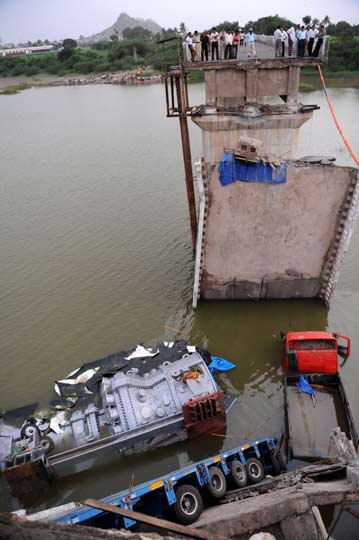图:印度一大桥垮塌 大货车掉入河中(2)