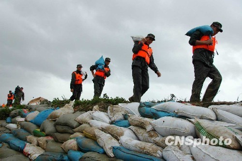 8月9日,福州市马尾区亭江镇长柄村沿江一段江堤塌方告急,危及长柄村路段的104国道、500多亩农田和几十个养殖场。福建省公安边防总队海警一支队二大队闻讯冒雨赶赴险堤,经过三个多小时的奋战,用编织袋装泥筑牢了堤坝。中新社发 张炜 摄