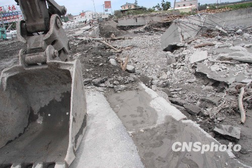 “莫拉克”台风远离,但其引发的“88水灾”为台湾近50年来仅见,据官方统计,截至8月11日早晨,“莫拉克”已造成38人死亡、35伤、62人失踪。图为重灾区之一的台东县太麻里乡出动大型机械设备,抢修因洪水溃堤而遭受重创的交通。 中新社发 董会峰 摄