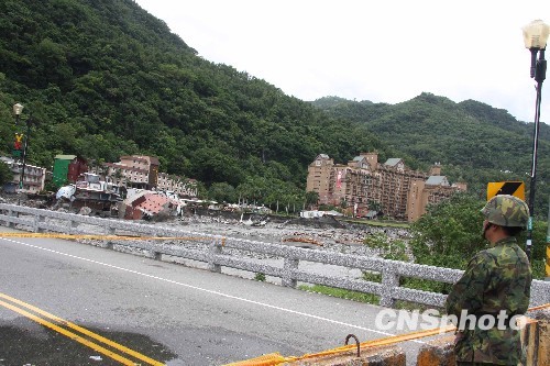 图为重灾区之一的台东县知本温泉区,一名士兵在桥畔守望断楼。中新社发 董会峰 摄