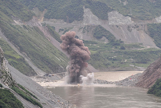 2009年8月11日下午,四川汉源县大渡河壅塞体进行爆破。