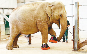 现年40岁的盖伊多年来一直备受脚部脓肿瘤的困扰,近些年又有不断恶化的趋势。于是盖伊的饲养员特别为它的前足订做了这双足以支撑起体重的鞋子。
