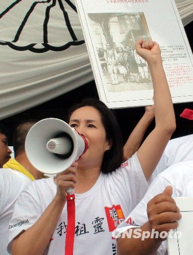 高金素梅8月11日率领“还我祖灵队”约50人首度成功“突袭”进入日本靖国神社正殿前的大广场,要求靖国还我祖灵及日本谢罪赔偿。中新社发 918网老吴 摄