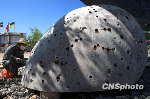 8月18日,位于新疆乌鲁木齐市南湖市民广场的国际城市雕塑创作营内,工作人员正在对雕塑作品进行精雕细琢。中新社发 刘新 摄