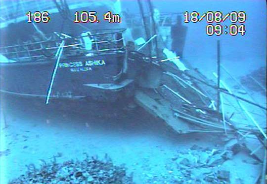 在诺穆卡群岛西南11海里的110米深海底的“阿斯卡公主”号渡轮残骸。