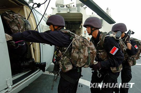 “舟山”舰4名全副武装的特战队员正在登机准备实施随船护卫。