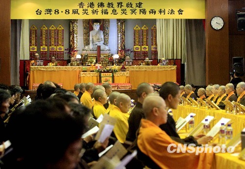 八月二十二日,香港佛教联合会在香港佛教联合会文化中举行“台湾8·8风灾祈福息灾冥阳两利法会”,超度莫拉克灾难亡灵早登极乐,并祈愿灾民早获救助,脱离苦海。法会由香港佛教联合会会长觉光长老亲自主法。这次法会主要诵读《佛说阿弥陀经》。中新社发 张勤 摄