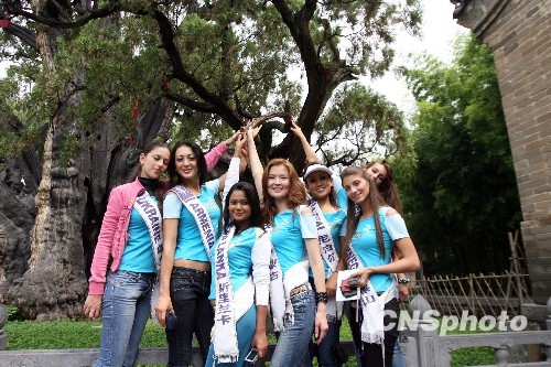 8月23日,河南登封嵩阳书院,120个国家和地区的2009国际旅游小姐冠军总决赛的选手们和汉封将军柏合影,希望能给自己带来好运。嵩阳书院内的将军柏为原始柏,树龄有4500年,是中国现存最古最大的柏树。中新社发 王中举 摄