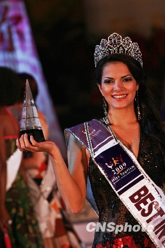 图为委内瑞拉选手经过激烈的晚装角逐,最终夺得在河南新郑举行的2009国际旅游小姐最佳晚装小姐冠军。中新社发 王中举 摄