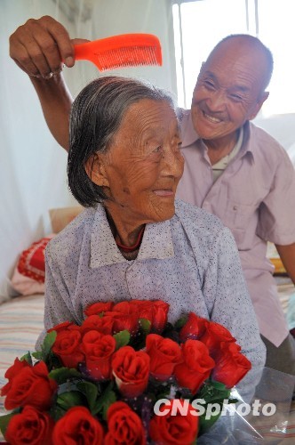 8月25日,七夕临近之际,山东省滨州市滨城区堡集镇敬老院79岁的韩福兴将一束鲜艳的玫瑰花捧给99岁的老伴郑其娥,百岁老人郑其娥脸上露出了幸福的笑容。中新社发 王际灵 摄