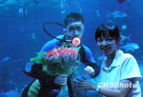8月26日是中国传统七夕情人节,杭州一小伙在杭州极地海洋公园海底向女朋友求婚。最终姑娘被小伙真诚打动,有情人终成眷属。中新社发 王磊 摄
