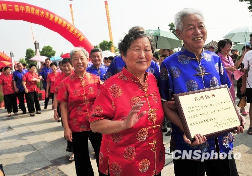 8月26日,恰逢我国传统的“七夕情人节”,20对身着唐装彼此忠诚、相濡以沫、风雨同舟走过金婚、银婚的幸福伴侣,在安徽宣城举行金婚庆典。中新社发 芮生 摄