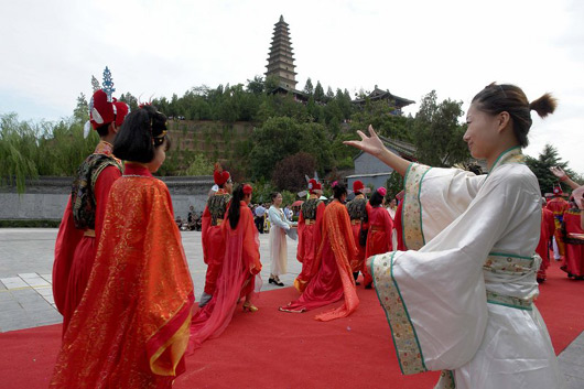 8月26日是“七夕”节,在《西厢记》故事的发生地--山西省永济市普救寺,99对国内外情侣携手参加“中国永济首届国际‘情定西厢’中国式婚俗大典”。刘宝成/CFP